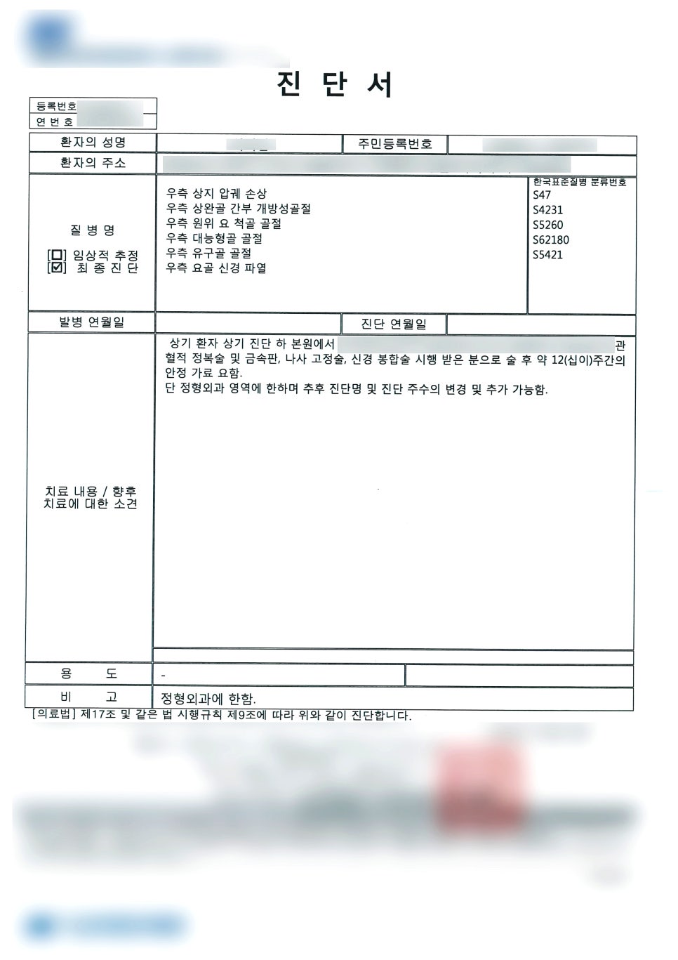 심한 골절 상태라서 수술을 받으신 후에 약 12주간 안정을 취하는 것이 필요한 상황이었죠. 참고로 후유장해 진단서를 받기 위해서는 6개월 간의 기간이 있어야 합니다. 수술일 또는 사고일 이후로 6개월이 경과해야만 진단 조건이 된다는 점 꼭 기억해두세요!