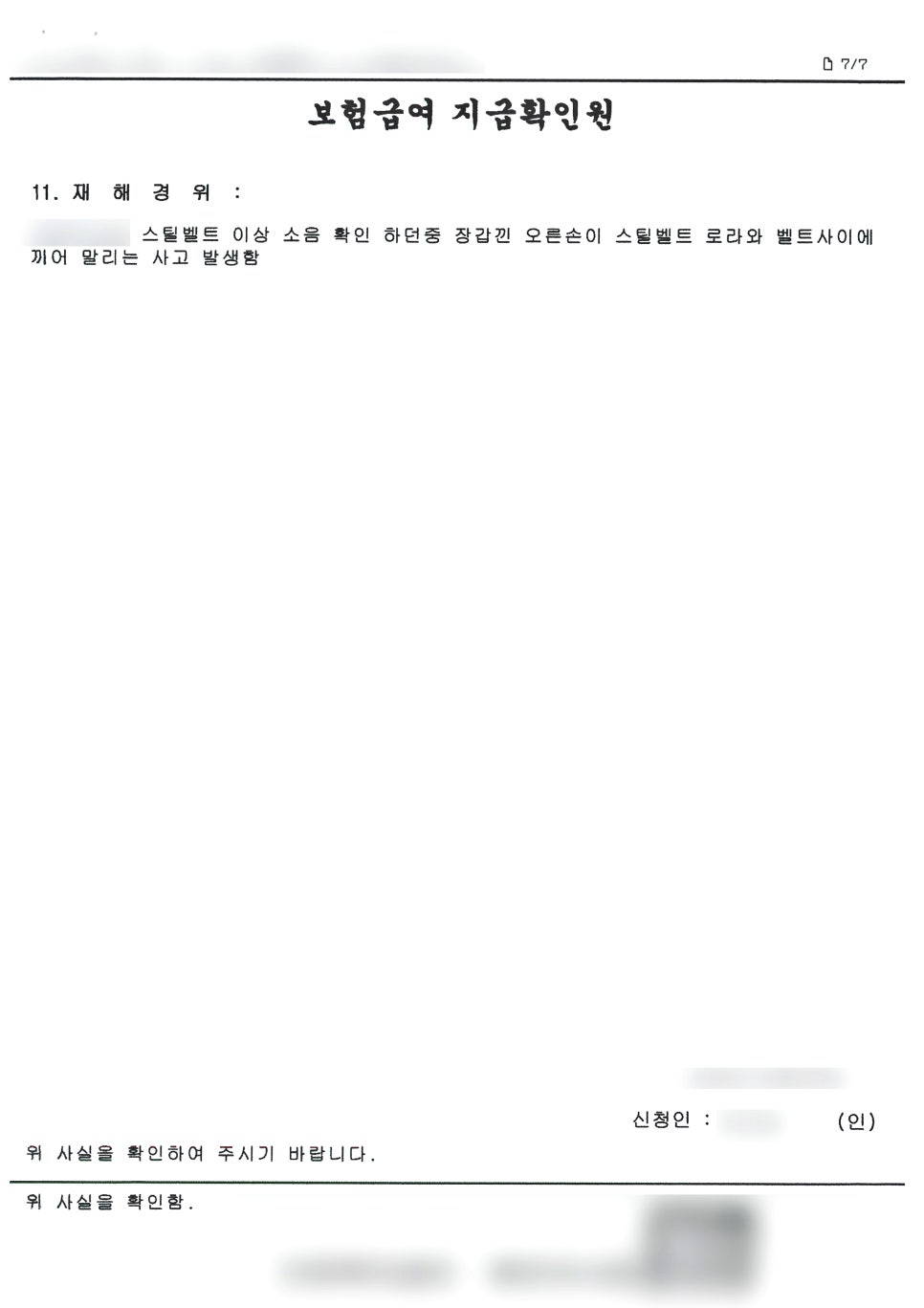일하면서 이런 저런 사고들이 많이 발생하는데, 오늘 역시도 일하던 도중에 다치신 사례입니다. 스틸벨트 이상 소음을 확인하려는 중에 장갑을 끼고 있던 오른손이 스틸베리트 벨트와 로라 사이에 끼어 말린 사고입니다. 이렇게 손이 다치게 되었어요.