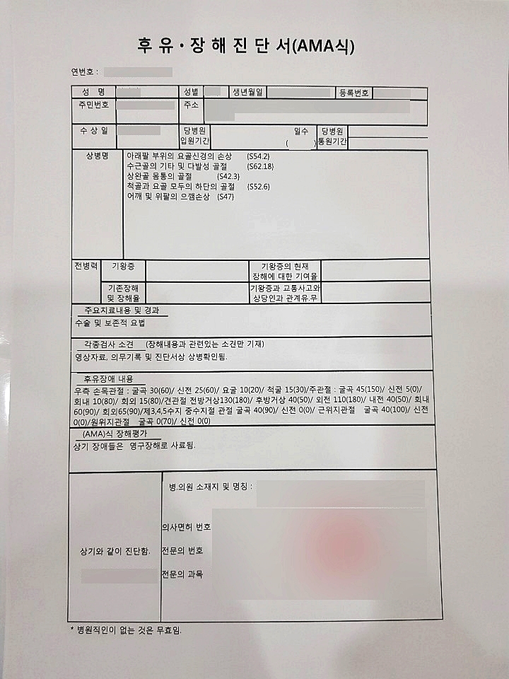 이분은 후유장해 진단을 받으셔서 이렇게 위의 자료인 후유장해 진단서가 발급 되었습니다. 이를 통해 보상을 받을 수 있는 길이 열린 것이죠~ 스스로 사고를 냈다고 해도, 누군가에게 사고를 당한 등등의 사고에 있어서 보상을 받을 수 있는지 저희 보상 파트너에서는 친절하게 답변 드리고 있습니다.