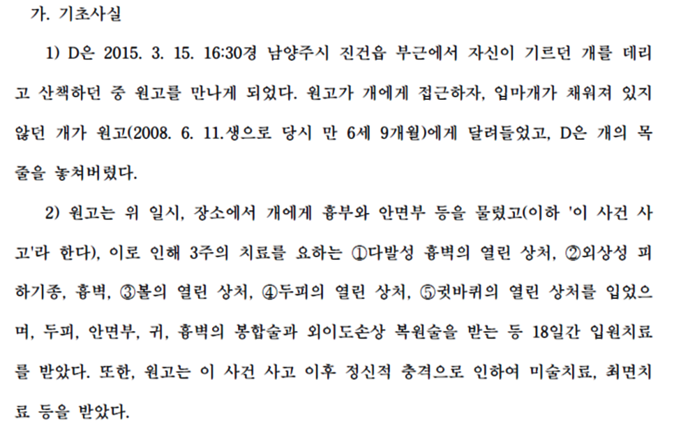 원고(피해자 - 만6세 9개월) D (강아지 주인) D씨는 반려견을 데리고 산책하던 중(입마개를 하지 않은 상태) 원고가 개에게 다가오게 되었고 개는 원고에게 갑자기 달려들었었고 그바람에 아이가 안면부와 흉부 등을 물렸고 3주가량 치료를 요하는(입원치료) 상처들이 많이 발생하는 결과를 초래하였습니다..