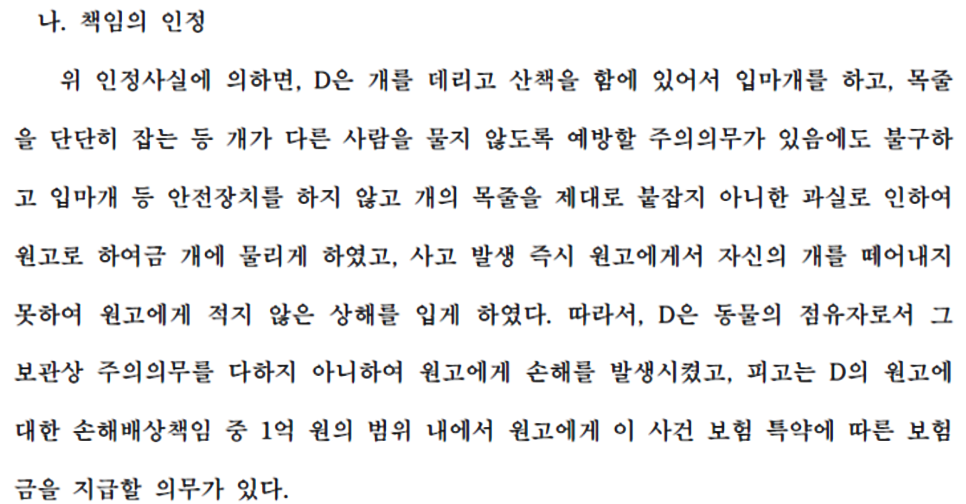 이 판례에서 말하길, 피고가 손해배상을 해주어야 한다고 하는데 이 피고는 보험회사를 말합니다. 보험사 쪽에 D씨가 가입한 '일상생활배상책임보험' 이 있기 때문에 보험사가 대신하여 손해배상을 해주겠다는 것입니다.