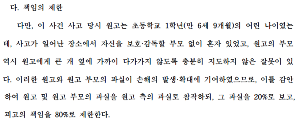 하지만 아직 어린나이였던 원고이고, 사고 장소에 보호자 없이 혼자 있었으며 이러한 사고 위험성을 사전에 미리 알려주고 지도하였어야 할 의무에 대한 과실이 인정 되었습니다. 20%가 부모에 대한 과실로 나누어지므로 나머지 부분만을 받을 수 있었습니다.