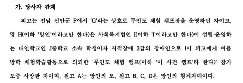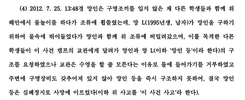 위에 첨부되어 있는 판결문을 읽으시다보면, 정말 속이 터지실 수도 있습니다 ㅠㅠ 물놀이를 하던 중 피해학생이 조류에 휩쓸려 가는 돌발상황이 발생했을때, 체험캠프에 있던 교관은