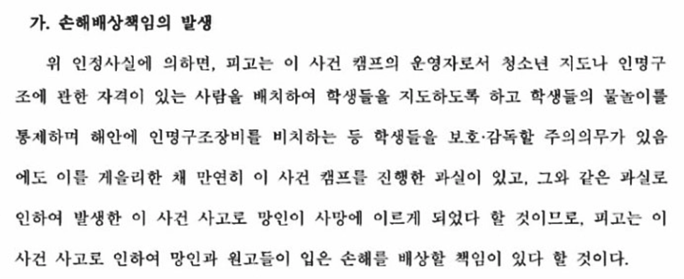 법원에서는 해당 업체가 청소년 지도 및 인명구조에 관한 자격증이 있는 사람을 배치 하지 않았으며 해안에 인명구조장비를 배치하지 않은점 등등 학생들을 보호 감독할 주의의무를 무시하였기 때문에 사고가 발생했음을 인정하였고 이에 대해** 피해학생에 대한 손해배상책임이** 해당 업체에게 있음을 판시했습니다.