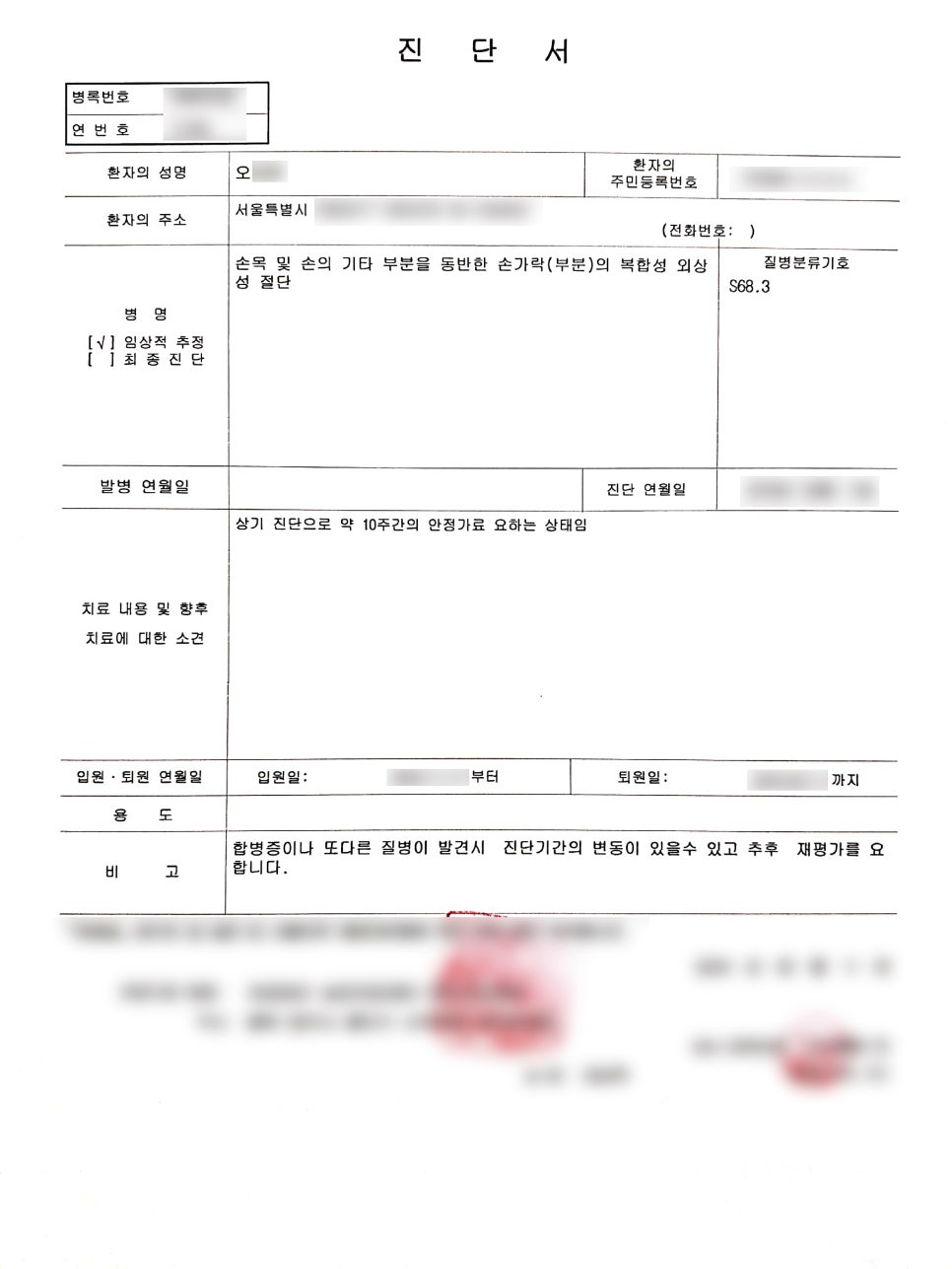 손에 끼이는 사고가 발생하게 되었어요. 결국은 손가락을 절단 하셔야 했죠. 손가락이 절단되어야만 했던 상황을 설명해주는 사진입니다. 결국은 절단을 하게 되었는데.. 진단서에 보시면 추가적인 정보를 더 볼 수 있습니다. 생각만 해도 아주 끔찍하고 어지러운 상황이셨을텐데 정말 잘 이겨내셨다고 생각합니다!