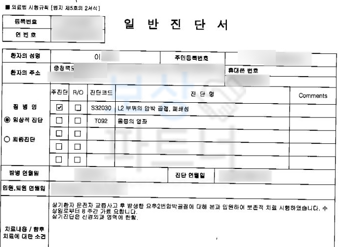 본론으로 돌아와 이@@님은 위 사고로 요추2번 압박골절 진단을 받으셨고 다행히 골절의 정도는 심하지 않아 허리 보조기를 착용하며 보존치료를 진행하셨습니다.