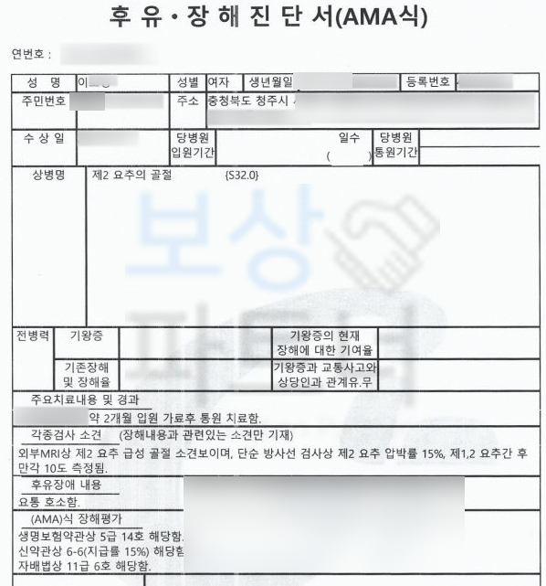 다만 **보험 가입시기에 따라 ** 보험약관이 상이하기 때문에 분석이 필수이며 전문의가 서로 상이한 장해의 기준과 올바른 장해평가 방법을 이해하고 있어야 할 것입니다. 다행히 이@@님은 늦지 않게 연락주셔서 손해배상이 아닌 개인보험 청구이기에 AMA방식의 후유장애 진단서를 발급받았고 각 보험사에 청구를 진행하게 되었는데요,