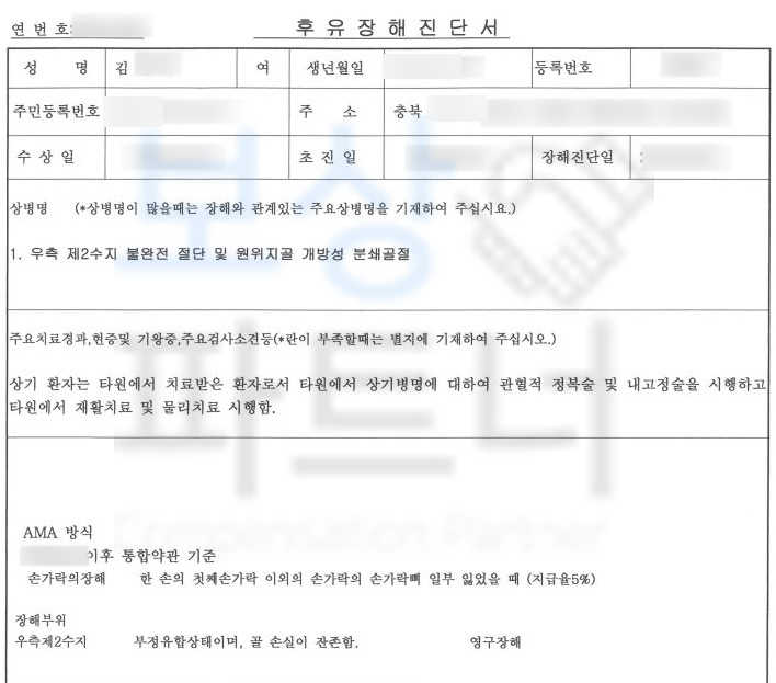 개인보험 후유장애 보상파트너에게 맡겨주셔서 손가락의 장해 골 손실을 인정받아 5% 지급율을 청구하였습니다. 1억 5천만원의 담보 가입이 되어 있어서
