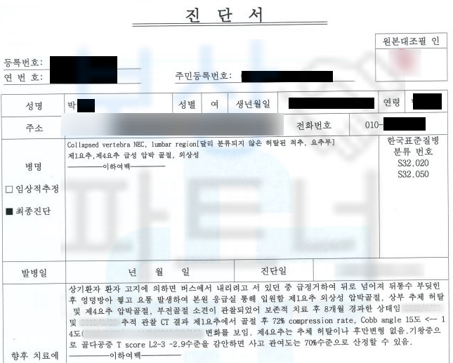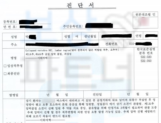 오늘 소개해드릴 사건이 버스에서 넘어짐 으로 인해 1번 4번 요추 골절 되신 박@@님의 사건입니다.