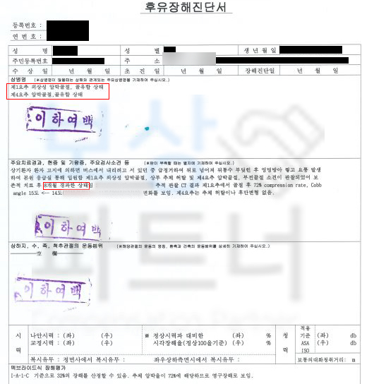 그래서 많은 분들이 후유장해 진단서를 누구에게 어떻게 받아야 하는지 문의가 많으신데요, 박@@님은 다행히 늦지 않게 연락주셔서 AMA방식의 장해진단서를 발급받도록 도와드렸습니다. 또한 위 진단서를 토대로 보험회사에 보험금을 청구하였는데요