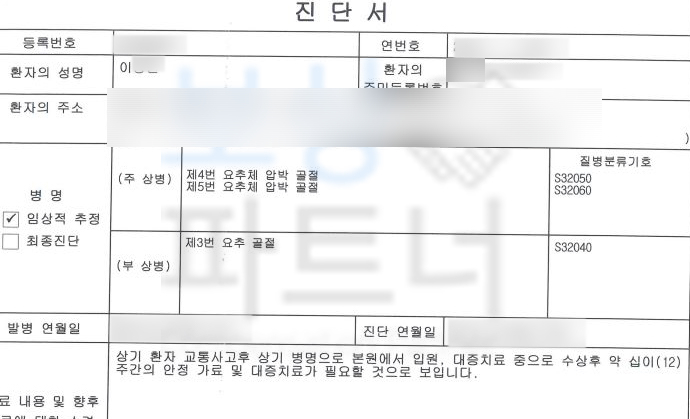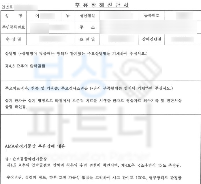 안녕하세요 보상파트너 정팀장입니다. 척추골절 보상전문 보상파트너에서 실제 보상 후기 소개해드리겠습니다.