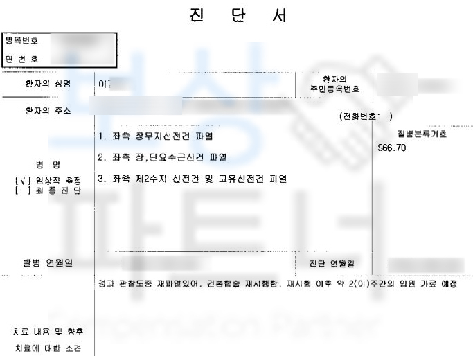 이@@님은 보상파트너와 함께하여 무사히 후유장해진단서 발급을 받으셨고 보험사와 약 한달간의 분쟁이 오간 결과