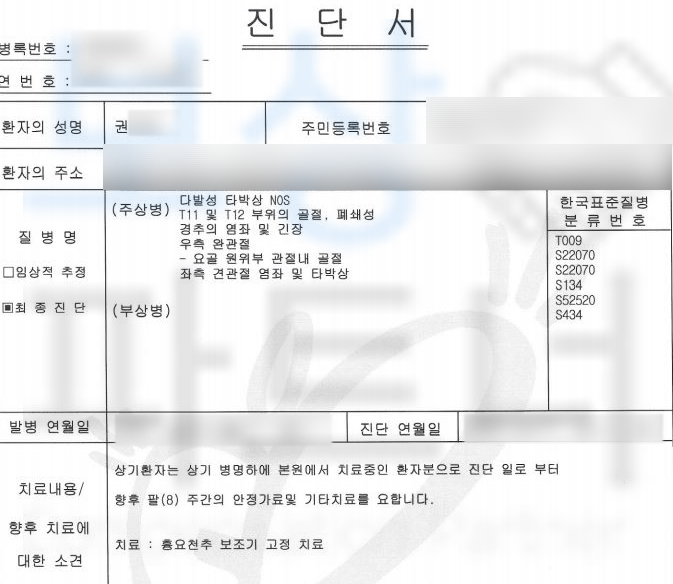 권@@님은 척추보조기 (TLSO)를 착용하시며 전치8주 즉 8주간의 안정을 취하셔야 했습니다. 권@@님은 사고 초기부터 보상파트너에 연락주셔서 함께 보험증권과 사고경위, 영상CD를 보고 상담을 도와드렸습니다.