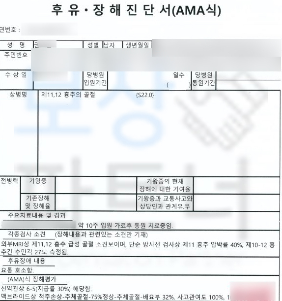 뿐만 아니라 허리 골절, 즉 흉추 골절은 골절진단비,실비,입원비 뿐만 아니라 후유장해보험금도 확인하셔야 합니다. 저희는 보상 가능성을 확인해