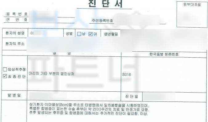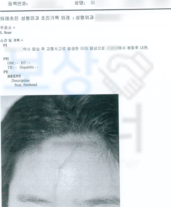 안타깝게도 위 사진처럼 이마에 큰 흉터가 남을 것이 예상되었죠. 아니나다를까.. 계속된 성형외과적 흉터제거술을 받아도 흉터는 계속 남아 이@@님에게 큰 스트레스였습니다. 이@@님은 사고 직후 알고 지냈던 보험 설계사의 소개로 보상파트너를 만나 보험사 합의금 산정장해보험금 청구를 위임하셨는데요, 운전자의 차에 동승한 경우라면 운전자 즉 택시기사님의 보험사를 통해 합의를 진행할 수 있습니다.