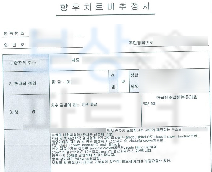 이@@님은 재직중에 있으셨기에 근로소득과 얼굴 흉터에 대한 보상, 흉터 치료에 대한 향후치료비도 산정하였고