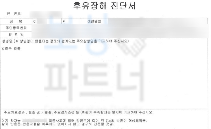 다만 장해를 증명하기 위해서는 의료 전문의의 후유장해진단서가 필요한데 문제는 일반 병원에서 발급이 잘 어려울 뿐더러 성형외과에서도 **발급받을 수 있는 병원이 ** 한정적입니다.
