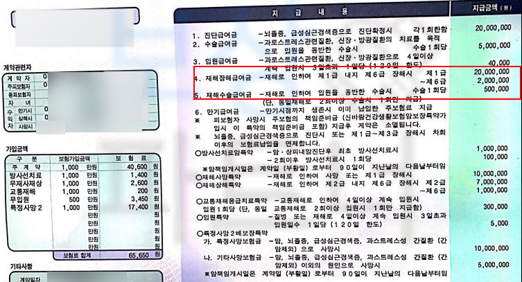 위 진단으로 이@@님은 최소 10주간 TLSO 보조기 즉 허리보조기를 착용하시며 요양하셔야 했습니다. 여러분들의 보험증권에 “후유장해” 항목 찾아보세요. 위 보험증권들을 보면 가입하신 보험의 기본계약에 있거나 혹은 특약으로 후유장해 보상 항목이 있습니다.