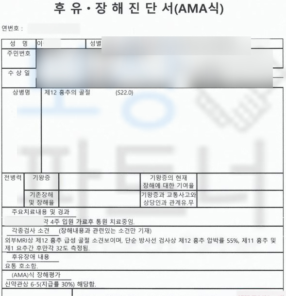 무려** 30%의 지급률 뚜렷한 기형**에 해당하셨습니다. 저희는 이를 기초로 손해사정서와 각종 증빙서류를 제출하였습니다. 물론 보험사에서는 이전의 질병들을 조회하며 골다공증의 여부와 각도와 압박률의 적절성에 대해 의료자문을 시행했지만 보상파트너의 적절한 대응으로 결국 저희가 처음 청구한 30% 지급률 인정되어