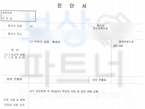 요추2번 척추압박골절 진단을 받아 허리보조기를 착용하시며 12주간의 요양이 필요하였습니다. 내 보험에서 "장해” 담보 가입 유무 확인해주세요. 이@@님은 압박골절 보험보상 을 인터넷에 검색해보시다가 저희 보상파트너로 연락주셨는데요, 저희는의뢰인의 전문가 상담 진행을 위해 영상CD, 보험증권, 의무기록등을 요청드렸고 서류를 검토 후 진행 과정을 설명드렸습니다.