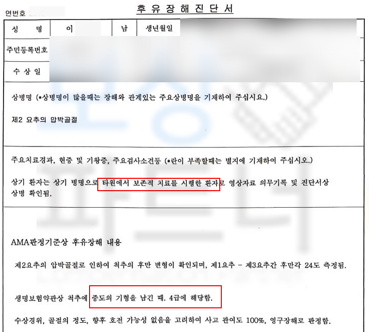 생명보험약관상 척추에 중도의 기형 장해 4급에 해당하셨죠. 저희는 위 진단서를 기초로 손해사정서를 작성하여 보험사에 청구하였고 물론 내부자문과 심사 과정을 거치며 서류 첨부 보완, 보험손해사정사의 이의가 있었지만 보상파트너의 적절한 대응으로 장해율 모두!
