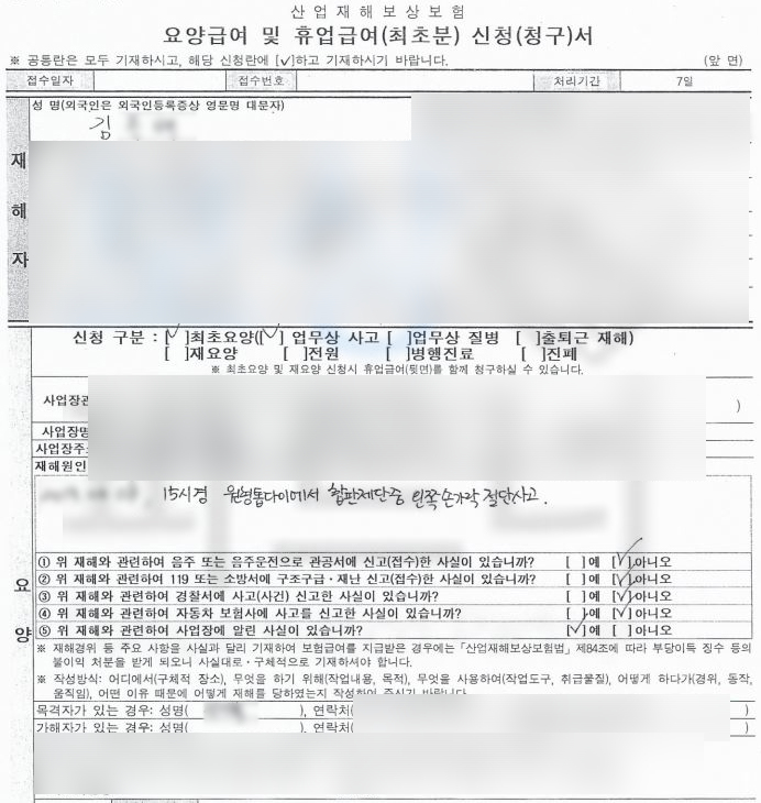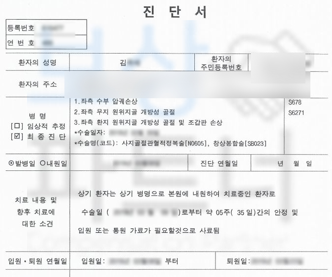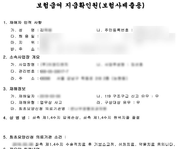 압궤 손상을 동반한 골절이었죠. 먼저 일하시다 혹은 출퇴근 중 발생한 재해라면 산재보험에서 보상 가능하십니다. 대부분 많은 분들이 회사에서 병원 원무과를 통해 최초 산재신청은 무사히 하십니다.