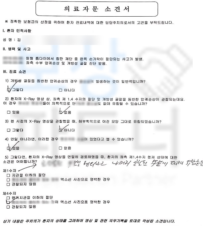 이후 김@@님의 올바른 장해 진단을 위해 주치의의 소견서를 요청했고 보험금 지급의 타당성을 제시하는 손해사정서와 관련 증빙자료를 보험사에 송부하였습니다.