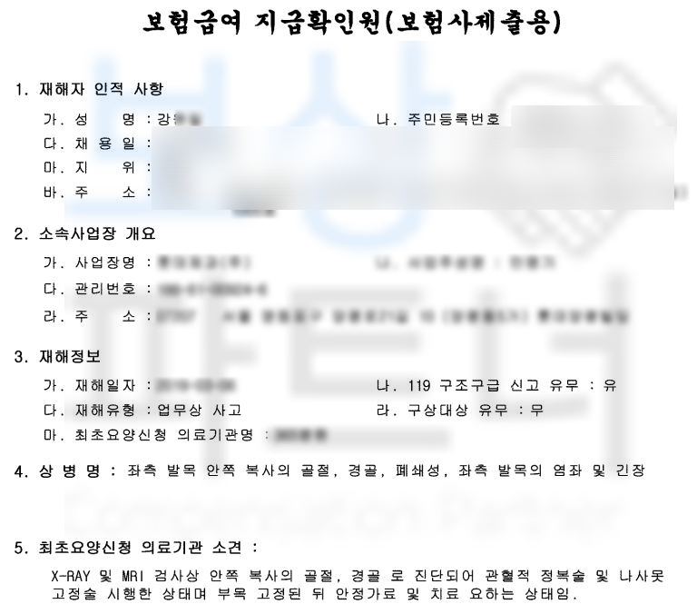 수술 후 사진도 함께 보시죠. 먼저,** 산재보험**과 일반 생손보험에서 보상가능합니다. 저희 보상파트너는 산재사고를 당한 재해자의