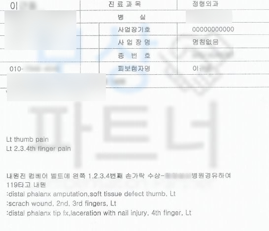 이@@님은 회사에서 일하시다가 컴베이어 벨트에 좌측 손이 딸려가는 재해를 당하셨습니다.