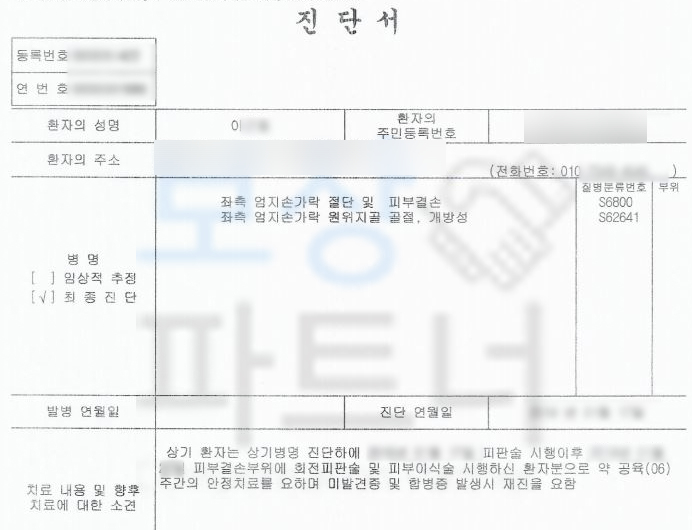 위 의무기록을 보시면 왼손의 첫째 손가락 즉 엄지손가락 뿐만 아니라