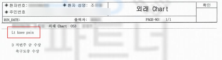 위 의무기록을 보시면 Lt Knee pain 즉 왼쪽 무릎의 통증 적혀있고 사고 경위 역시도 축구 도중 수상함 으로 적혀있습니다. 위 사고로 문의주신 고객님은