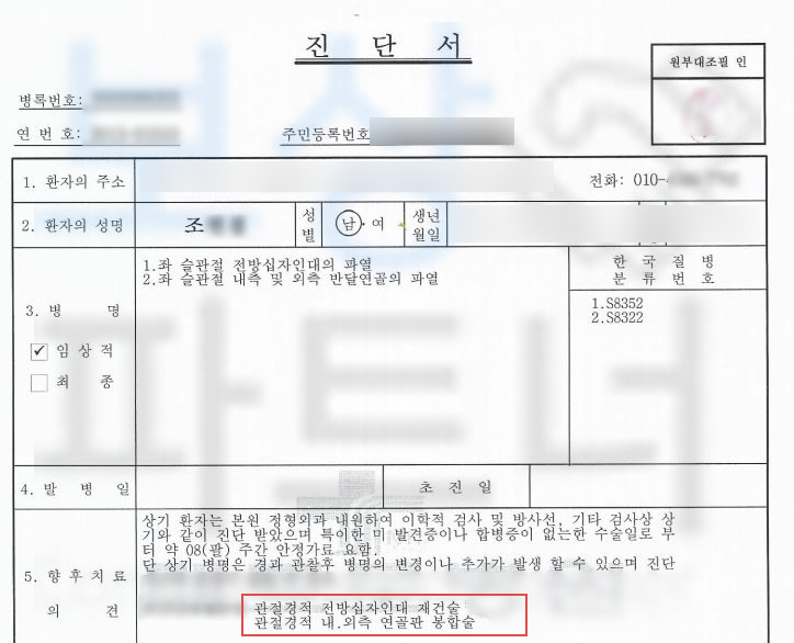 진단을 받았고 전방십자인대재건술 을 받아 8주진단 요양을 하셔야 했죠.