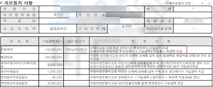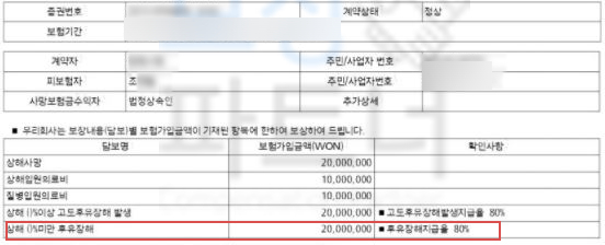 저희는 의뢰인의 보험증권을 우선적으로 확인하여 후유장해 보험금 청구가 가능한 상황인지 파악하였습니다. 그 결과 고객님의 모든 보험 종합하여 후유장해 5천만원 담보 형성되어 있었죠.