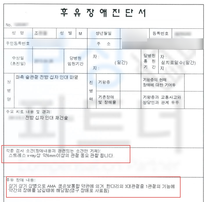 6mm 이상의 관절 동요로 약간의 장해 5% 지급율에 해당했죠. 저희는 위 후유장애진단서를 기초로 보험금 청구를 진행하였고 적정성을 증명하기 위해 의사자문 및 증빙자료도 함께 송부했습니다.