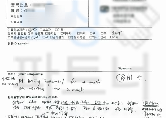 김@@님은 넘어져 우측 머리를 다치는 재해를 당하게 되었습니다. 넘어진 직후에는 청력보다 허리와 목의 통증이 심하셨고 위 부위를 중점으로 치료받으셨는데요, 시간이 점점 지나면서