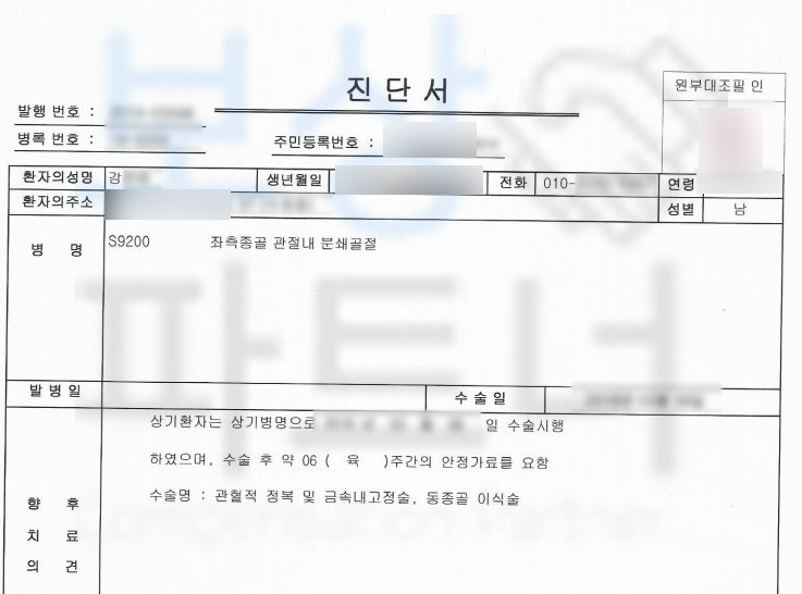 좌측 종골의 관절내 분쇄골절 s9200 진단을 받았고