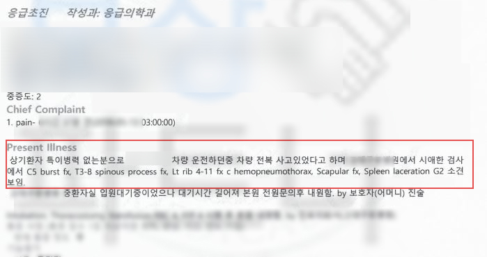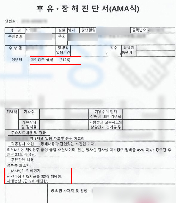 을 주 진단으로 받게 되었고 흉추의 골절 s22.0 도 함께 진단받았죠. 최소 12주간의 요양이 필요했고 앞으로의 생활 또한 어떻게 변화될지 모르는 상황이었습니다. 먼저, 후유 장해 보상은