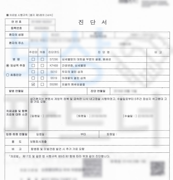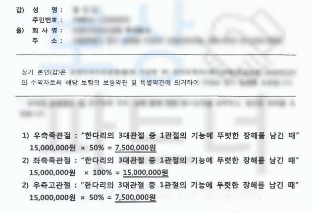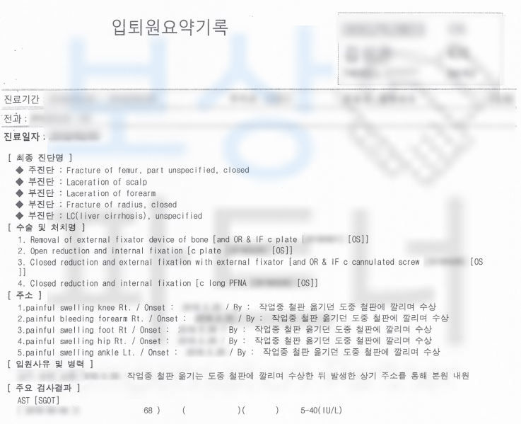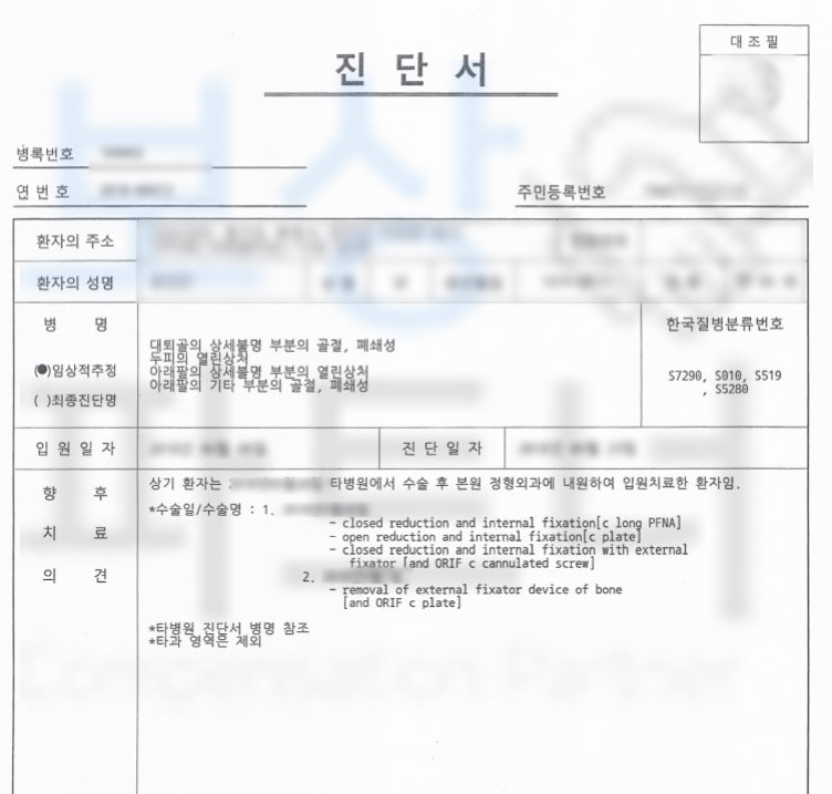 위 수상 경위를 보시면 대퇴골골절 뿐만 아니라 무릎과 발, 발목 등등 양 다리 전체적으로 사고를 당하셨죠.