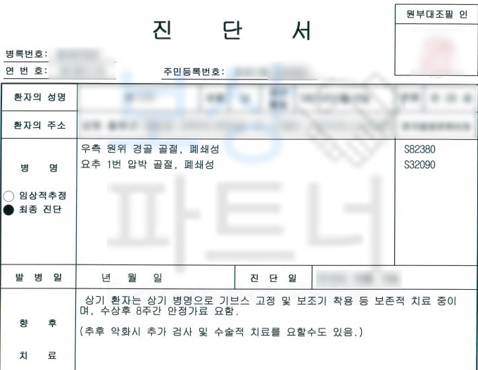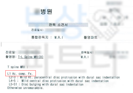 대부분 요추1번골절 환자분들처럼 전@@님도 허리 보조기를 착용하시며 최소 8주 진단 그 이상 요양해야 했습니다. 갑작스러운 추락 사고에 요추1번골절 진단받아 일을 못하는 상황