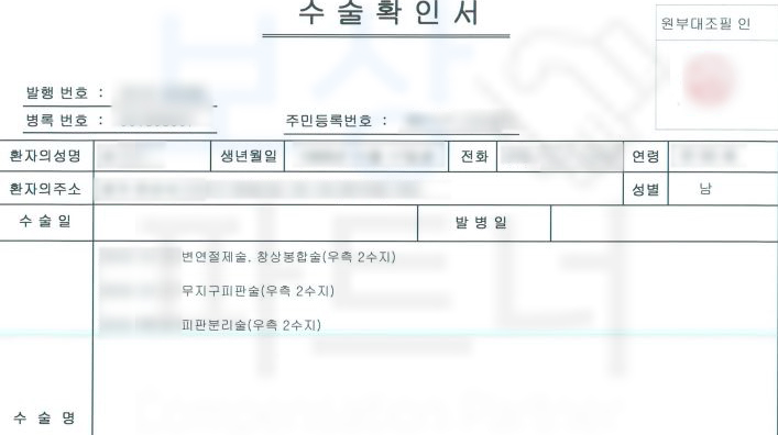 **피판분리술 **등의 수술을 받으셨습니다. 손가락골절 되었지만 핀 고정하지 않고 봉합술만 하였는데도 장해에 해당될까요?