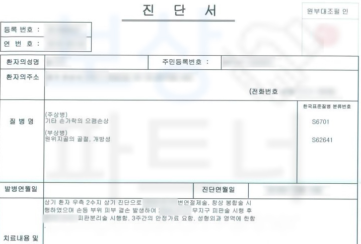 김@@님은 회사에서 일하시다가 컨베이어 벨트에 손가락이 끼는 사고가 발생했고 근처 병원에 내원하여 응급처치 후 수지 전문병원으로 이송되었습니다. 김@@님의 손가락의 골편이 이미 떨어져 나갔기에 핀 고정술보다는 봉합술을 위주로 시행했고