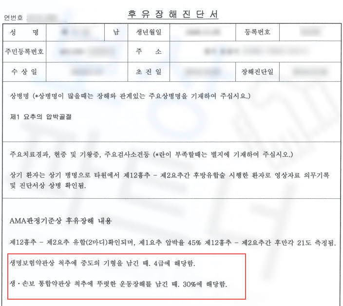 최@@님은 요추1번골절 옛날 생명보험 약관상 4급,