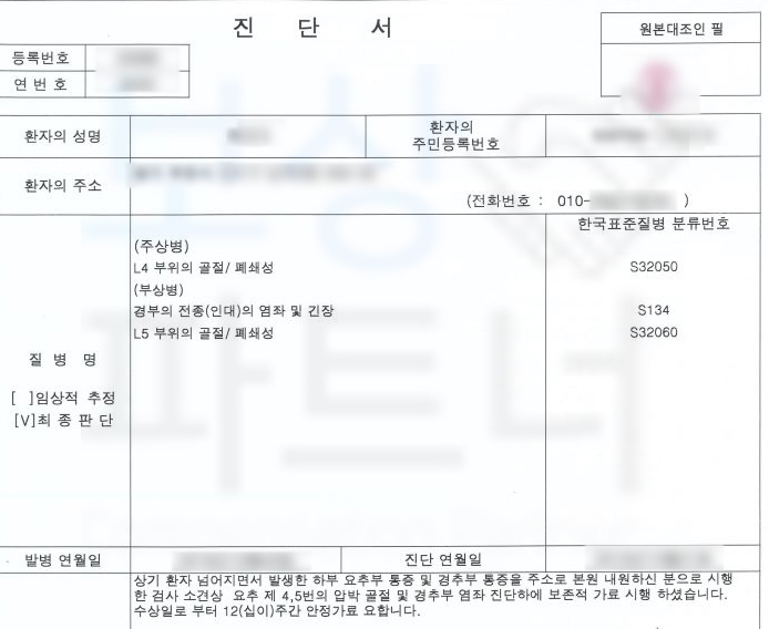 진단을 받으셨습니다. L 은 Lumbar의 약자로서 4번, 5번은 척추체의 숫자를 의미합니다.
