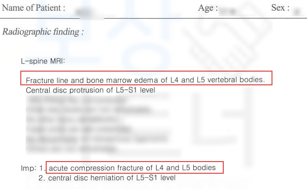 위 사진을 보시는 것처럼 요추 4번 5번이 압박골절되어 척추체의 전면이 주저앉은 모습 보이시죠? 요추 4번 5번 압박골절로 곽@@님은 TLSO 보조기를 착용하며 최소 12주간 입원 및 요양을 하셔야 했죠.