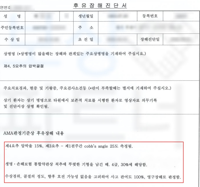 요추 4번 5번 압박골절로 TLSO 허리 보조기 착용하고 있는 상황 여러분들의 보험 증권에서 “후유 장해” 항목 찾아보세요. 피보험자가 사고에 의해 상해를 입고 그 직접의 결과로서 신체의 일부를 잃던가 신체의 기능에 영구히 장해가 남은 경우 지급되는 보험금을 의미합니다.