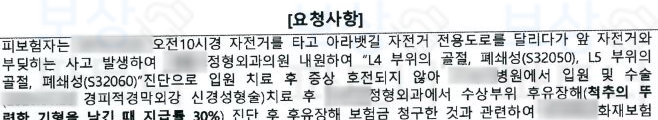 보상 파트너를 통해 요추 4번 5번 압박골절 후유 장해 보상받은 곽@@님의 사례 소개해드리겠습니다. 곽@@님은 자전거를 타던 도중 앞에서 주행하던 행인과 충돌하는 사고를 당하셨습니다. 자전거 대 자전거 사고로 넘어지면서 꼬리뼈 및 허리에 극심한 통증을 호소했고 곽@@님은 병원에 내원하여 정밀검사를 받으셨는데요,
