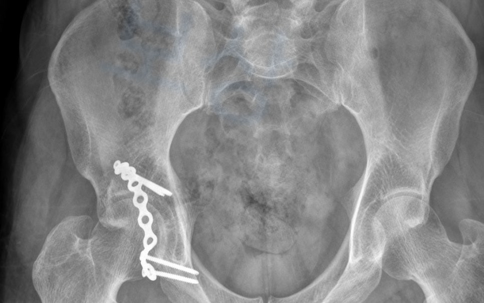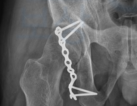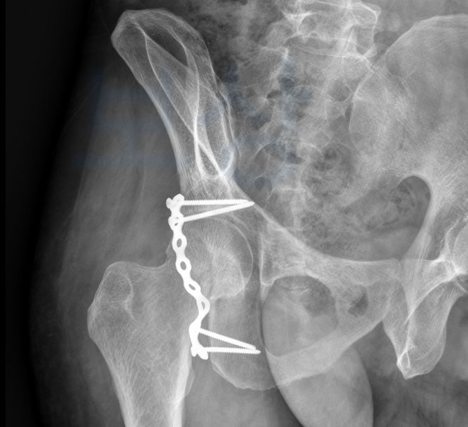 비구 후벽 골절 진단을 받으셨고 응급실에서 도수 정복 후 비구의 골절이 심한 상황이었기에 금속판 내 고정술을 시행하셨습니다.