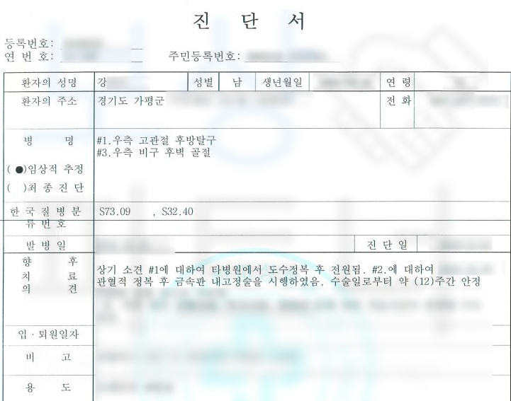 그럼 실제로 보상 파트너가 처리한 추락 사고로 고관절 후방 탈구 및 비구 후벽 골절 진단받은 강@@님의 보상 사례 소개해드리겠습니다. 보상 파트너로 연락 주신 강@@님은 주택 리모델링 현장에서 용접 작업을 하시던 중 용접 부분이 이탈하면서 2M 아래로 추락하는 사고를 당하셨습니다.