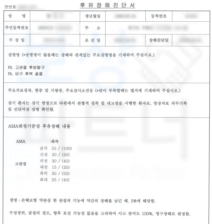 피보험자는 고관절의 운동 장해 약간의 장해에 해당되어 5% 지급율, 영구 장해로 진단되었습니다. 보상 파트너는 대형 보험사를 상대로 피보험자의 장해를 인정받기 위해 손해 사정서 및 증빙자료를 보험사에 송부하였습니다.