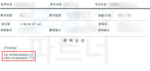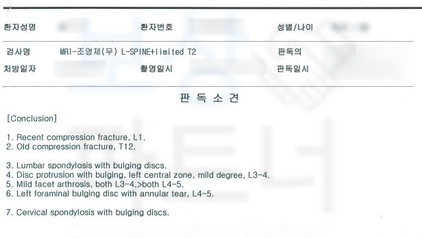 진단을 받으셨습니다. 여기서 L1 부위란 요추1번을 가리키는 것 다들 아시죠~? 영상 판독지도 함께 보실까요?